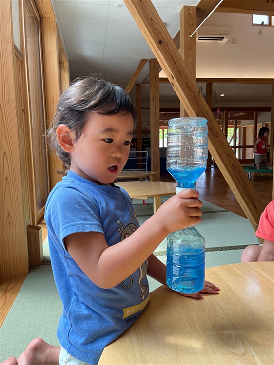 真剣な表情で力を入れてボトルの色水を押し上げたり、「やっぱりこうだ」と言ってひっくり返したりしました。