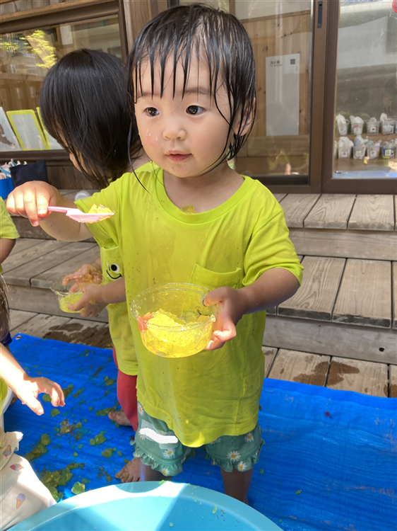 寒天遊びの中で、ただ触って楽しむだけでなく、年長児の姿から刺激を受けて興味や関心の幅を広げていく様子が見られた場面でした。