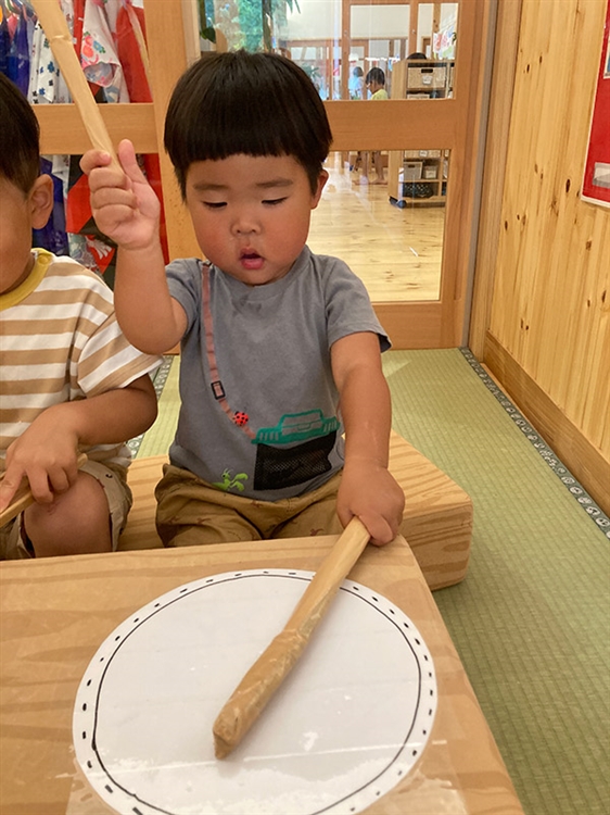 Tくんは「〇〇もするー!」と元気いっぱいに参加し、「ドン!ドン!そいやぁ!そいやぁ!」と大きな声を出しながら、夢中になって太鼓をたたいていました。