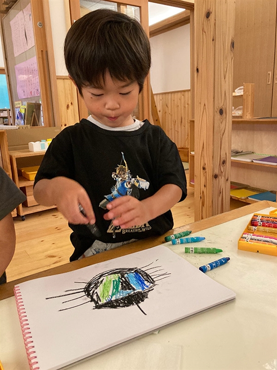 K君は大好きなカブトムシを描こうと、クレヨンを数本選んで集中して描き始めました。熱心にクレヨンを走らせていましたが、思うように描けなかったようで、「ぐちゃぐちゃになっちゃった…」と涙ぐんでいました。
