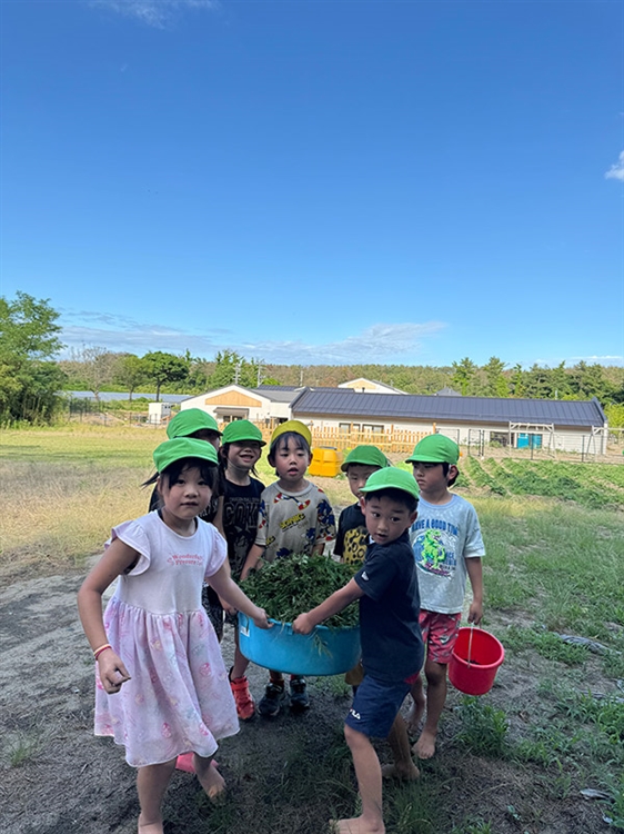 一人ひとりがバケツやじょうろを手に、「みんな、がんばろうね!」と声を掛け合いながら意欲的に取り組んでいます。活動が終わり、集めた雑草を一つのタライにまとめて、「みんなの分を集めると、「こんなにたくさん!」「みんな、すごいね!」と達成感いっぱいの様子がみられました。