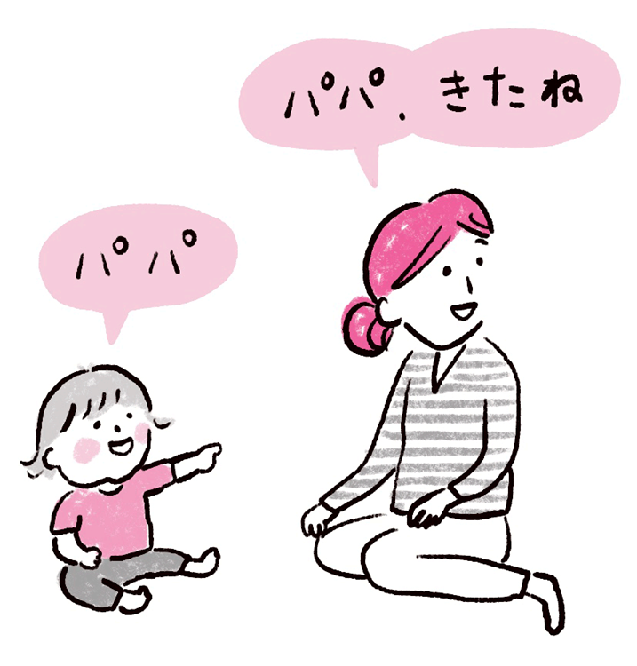 すでに、指差しや「あー、あー」などの声で人への訴えかけが始まっている子の場合は、試しに子どもの音をまねして遊んでみましょう。子どもが「ああ〜!」「うう」と声を出していれば、すかさず大人も「ああ〜!」「うう」と呼応していきます。ここで目が合ったり大人の反応を喜んだりする様子が見られたら、「自分の出した声が人に影響を与えている」という気づきが芽生え始めているので、ことばが出る日が近づいているといえるでしょう。
