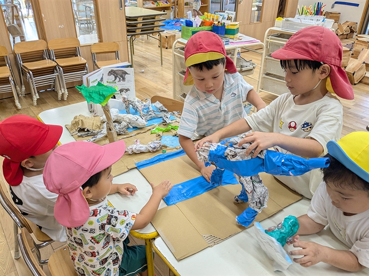 保育者が新聞紙で作った恐竜にきょうみをもった子どもたちは、保育者と一緒に恐竜を作り始めました。すると、次第に子どもたち自身で図鑑を見て、顔・身体・尻尾など恐竜の特徴を捉えながら、ツノなどを細かく作る姿がみられるようになりました。