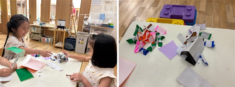 4歳児のAちゃんは、保育者に折り紙で鉛筆の折り方を教えてもらいました。Aちゃんが鉛筆を折っていると、Bちゃんが来て、Aちゃんに折り方を教えてもらいながら一緒に折り始めました。「これいっぱい折って、鉛筆いっぱいにしよ!」「い~ね~。ちっちゃいの作った後おっきいのつくろ!」など会話も弾み、だんだん楽しくなって気がつくと、大小のたくさんの鉛筆が並び、「たくさんできたね!」と笑い合う楽しそうな表情が見られました。友だちと一緒に作る喜びを感じ、かかわりの輪が広がったひとときでした。