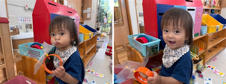 0歳児のAちゃんが、風車を手に一生懸命に吹こうとしていたので、私は横に座って一緒に吹く真似をしてみました。