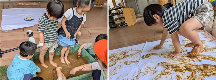 トロトロになった泥の中に、そ~っと片足から入ると「冷たくて気持ちいい!」や「どろどろだー」と足踏みをしたり、両手ですくって指を広げ、泥が流れるのを見たりして、泥の感触を楽しんでいるようでした。