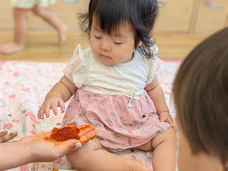 ゆっくりですが、保育者の楽しそうな表情や、「楽しいよ」の声かけで、安心してAちゃんも触ってみようかなと思ったようで、保育者と一緒に手や足を使ってゼラチンの感触を楽しんでいる様子がありました。