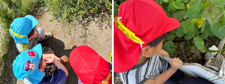 するとDくんが「スコップ持ってきて!」と言い、持ってきてもらったスコップを使って幼虫をありから離すと、ありの群れも散っていきました。幼虫が動き出したのを見て、「よかったな~」とみんなで話していましたが、Cくんが「また食べられるかも」と心配していたので、保育者が「畑なら大丈夫かもよ」と言うと、Cくんは、スコップに幼虫を載せて畑に連れていきました。そして、土の中へ潜っていくまでしっかりと見届け、「もう大丈夫やな」と安心した様子でした。どうにかして助けたい! という思いが救出成功になったようです。