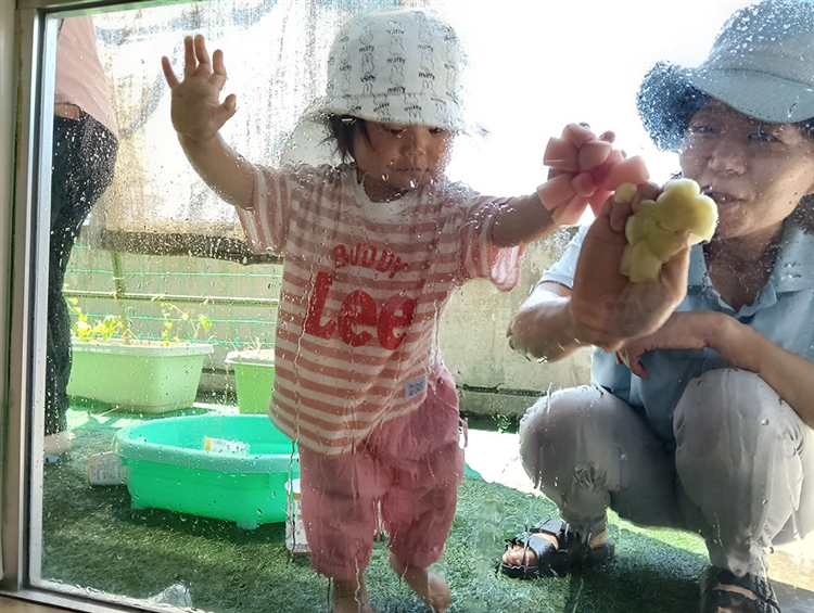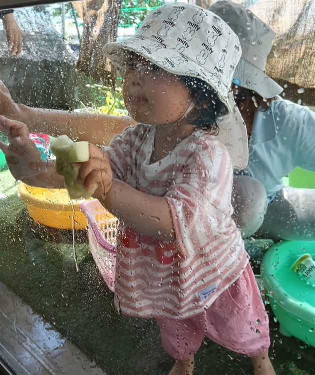 水遊び中、スポンジを手に取ったMさん。保育者が同じようにスポンジで窓ガラスを