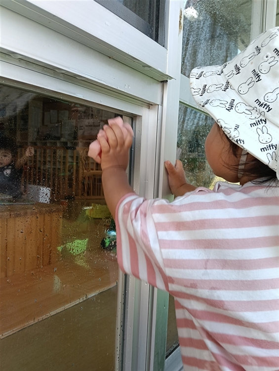 もともと大人のまねや家庭的な遊びが大好きなMさん。このやりとりが遊びのスイッチとなり、夢中になって繰り返し窓をこする姿が見られました。その姿から、ただ真似を楽しんでいるだけでなく、「窓をきれいにする」という目的意識や、達成感を味わっている様子が伝わってきます。窓がきれいになると、「ふう」と満足そうな表情を見せてくれました。