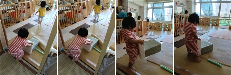 牛乳パックで作ったイスを押して遊ぶのが楽しい様子のKさん。手を置いて押すのにちょうど良い高さだったようで、保育室の中をあちこち進んでいました。畳スペースへ行く段差はどうするのかなと見守っていると、背もたれを持ち、イスをぐっと持ち上げて段差の上に置く姿がありました。