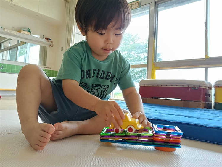 お部屋に入ると、今日は何で遊ぼうかなと考える姿が見られるTさん。先日保育者が作ったソフト積み木の橋に、お気に入りの車を走らせている姿が見られました。まっすぐな道路、でこぼこな道路、坂道、さまざまな道を車と一緒に楽しんでいました。