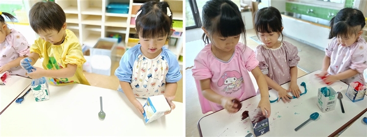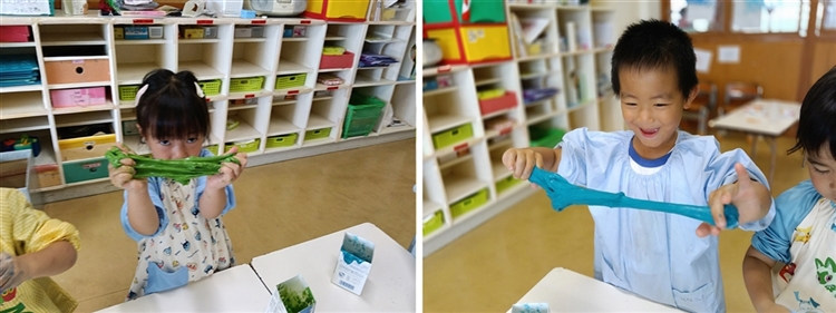 洗濯のりと好きな色の絵の具を混ぜたところに、ホウ砂水(魔法のお水)を入れ混ぜると、「わあー!すごい!!」と大喜び!! 完成したスライムを触ると「ぷにぷにしてる」と言っていました。