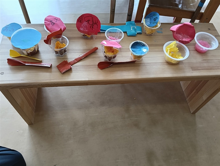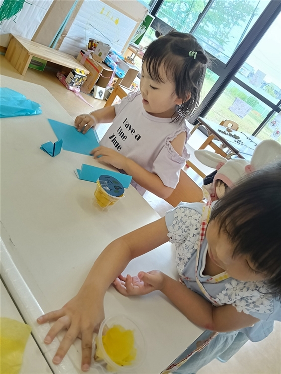 このかさんの真似をして花紙を使う姿や、オリジナリティを出すために茶色の折り紙を使ってカラメルを表現したり、プリンの光沢感を出すために水を入れてみたり……。