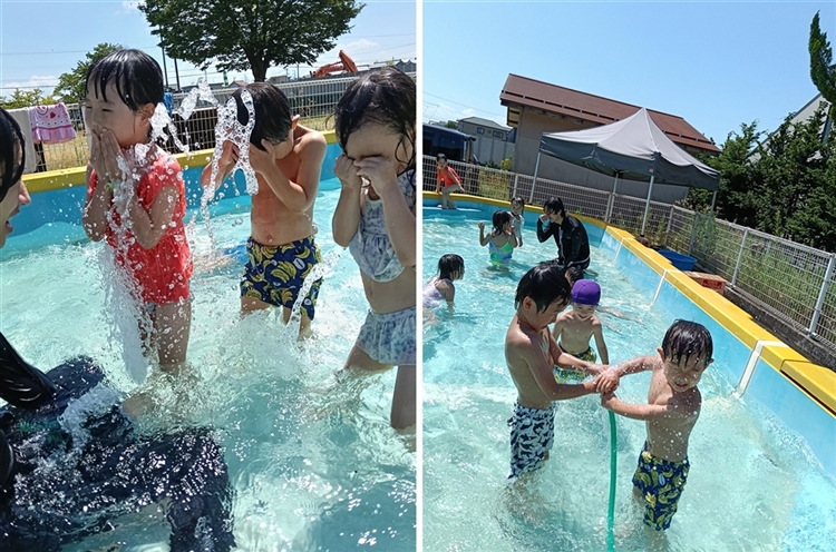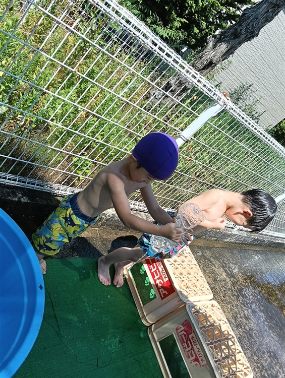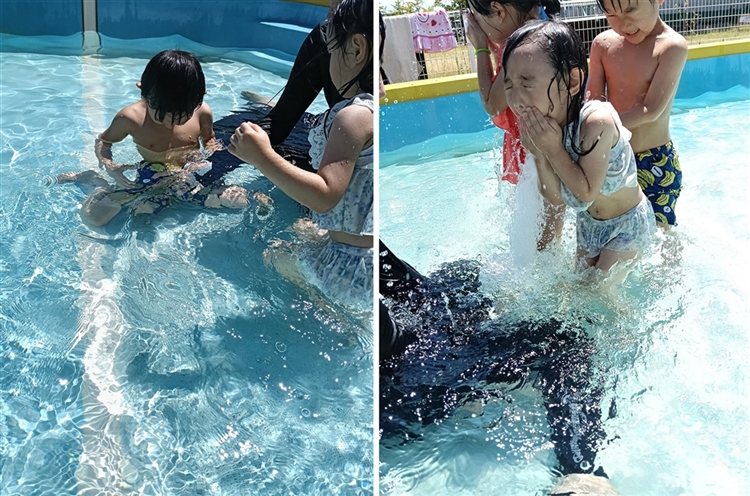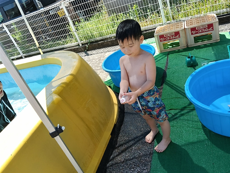 今日は昨日とは少し違った遊び方を展開する様子が見られ、先日の「顔をつける」という遊びを「何秒顔をつけていられるか」という遊びに発展させていたり、プールサイドでペットボトルの水てっぽうを使って楽しむ姿など新しい遊びを見つけたり、前の遊びを発展させている姿が見られました。