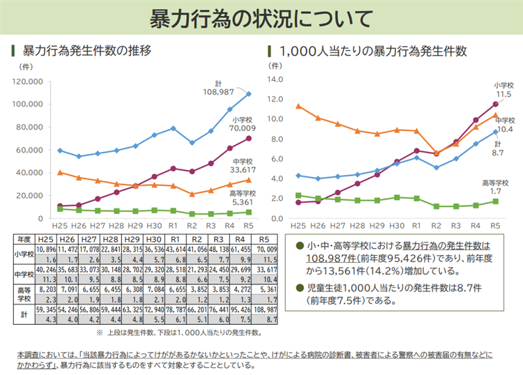 まず、現在の教育現場において、1000人あたりの暴力行為発生件数が2021年に小学校が中学校を僅かに上回り、現在は小学校が多いという事実をみなさんはご存知でしょうか? 小説「積み木くずし」に代表されるように、中高で吹き荒れていた暴力行為は、今やその舞台が小学校にとってかわろうとしているのです。学習環境の秩序が小学校で崩壊し始めていると言わざるを得ない状況なのです。