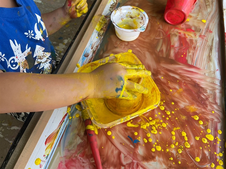 月2回行っているアトリエ施設「イハナ」での活動では、子どもたちが絵の具の感触や色の変化を楽しんでいます。お皿に入った絵の具を手で触って伸ばしたり、鏡の上にひっくり返して広げたりする姿が見られました。