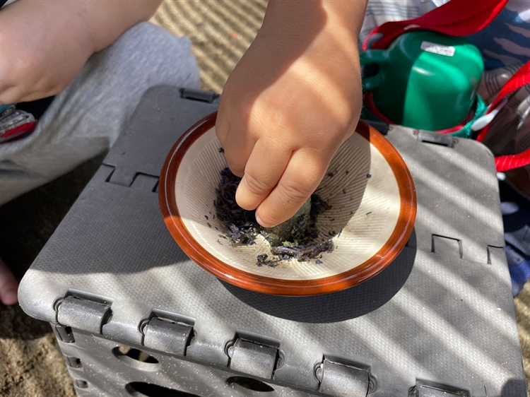 紫陽花の花をつぶして色水を作っていた子どもたち。夢中で混ぜているうちに、いつの間にか遊びはおままごとに発展しました。「ごはんできたよ!」と嬉しそうに見せてくれる姿に、自然物を通して広がる想像の世界が感じられます。