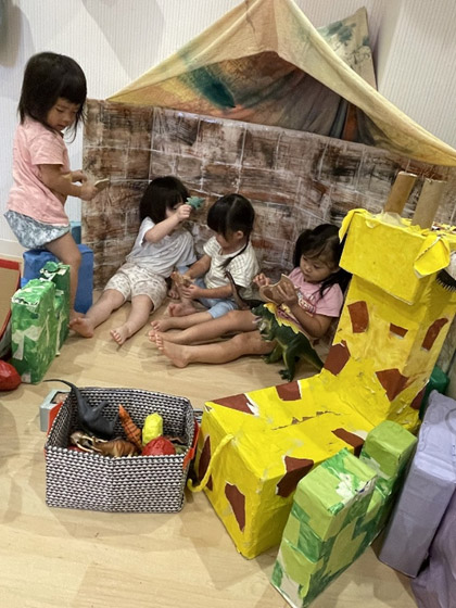 ある時、「ご飯ですよー」という子どもの声がしたので、声のほうを向くと、恐竜のフィギュアを並べてごっこ遊びをしている姿が見られました。またある時は「こっちいいよ!」と言って、近くにいるお友だちをテントの中に入れて遊ぶなど、遊びが日々発展しています。