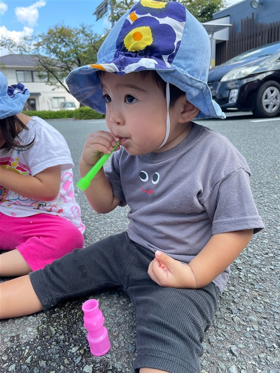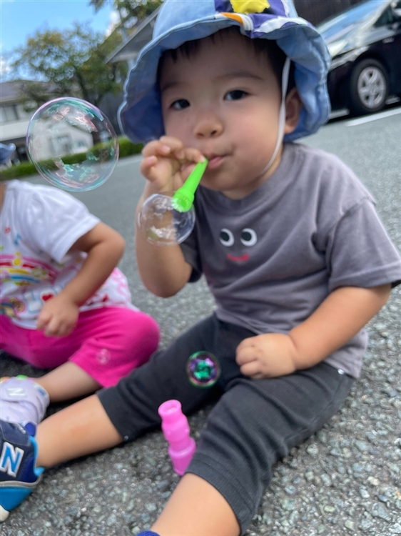 「自分で飛ばしたい!」という気持ちから何度も挑戦をしていました。最初はうまく膨らまず苦戦していましたが、あきらめずに続けるうちにコツをつかみ、ついにシャボン玉が飛びました。嬉しそうな笑顔で何度も飛ばし、「いっぱい飛んだね!」と声を弾ませる姿が印象的でした。Hくんのがんばりが輝く、素敵なひとときとなりました。