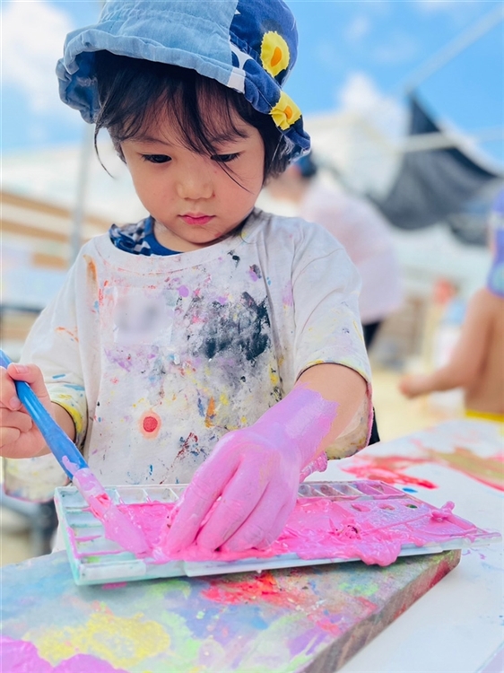 園庭で絵の具遊びをしていたEちゃん。ピンクが大好きでピンク一色になって遊んでいました。職員がパレットに絵の具を出して用意していたのですが、そのパレットまで塗り始めていました。周りにあったコップの容器も机も筆も…自分の手もぬりぬり。手の上で色を混ぜて「せんせー!なんか色変わったよ!」と嬉しそうに教えてくれました。ピンクの世界で素敵な笑顔を見せてくれました。