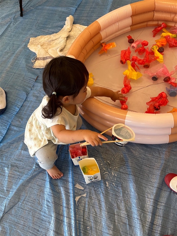 2歳のAちゃんは、年長児が企画した金魚すくいに参加しました。金魚(年長児が作ったもの)を水に入れると、泳いでいるようにゆらゆらと動く様子を見て、手で金魚をつかみ、容器に入れていました。