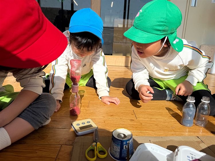 また、できた砂時計を使って、「砂が落ちるまでにここに戻ってくるね」と時間を試していた。遊びの中で数に興味をもち、36秒ってどのくらいなのか時間の感覚を体感していた。