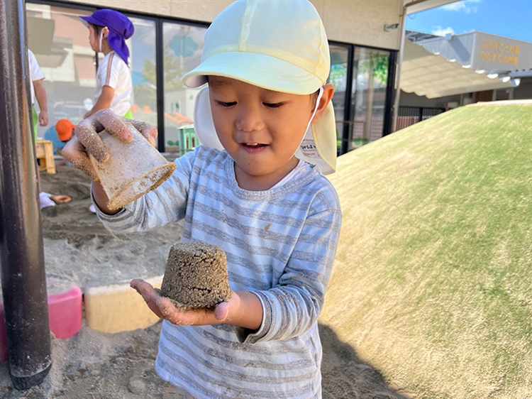 友だちと一緒に、砂場で型抜きを使って、アイスやプリンを作って遊んでいました。友だちは砂場やテーブルに型抜きをして並べている中で、Yくんは自分の手の平に器用に作っていました。