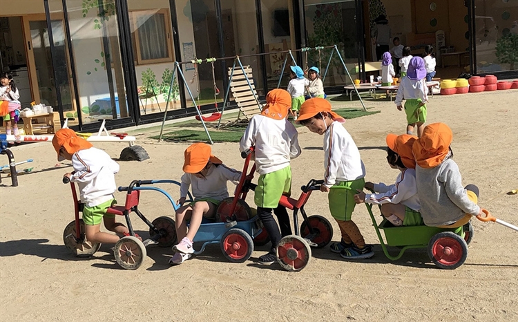 6人の4歳児の子どもたちが、三輪車と手押し車を見事につなげて、大騒ぎです。
