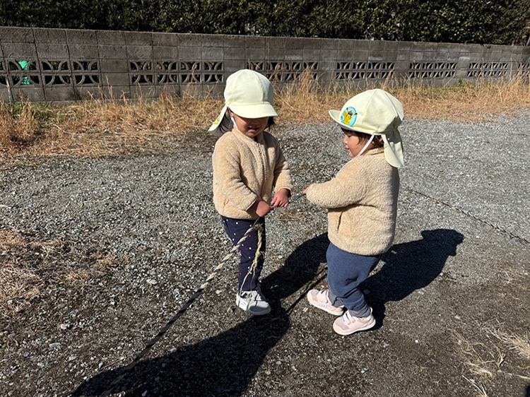 駐車場に張ってあった古いロープを見つけた、2歳児のMちゃんとKちゃん。手に取ると「うんとこしょどっこいしょ」と言いながら、身体を左右に揺らしながらロープを引っ張り始めた。