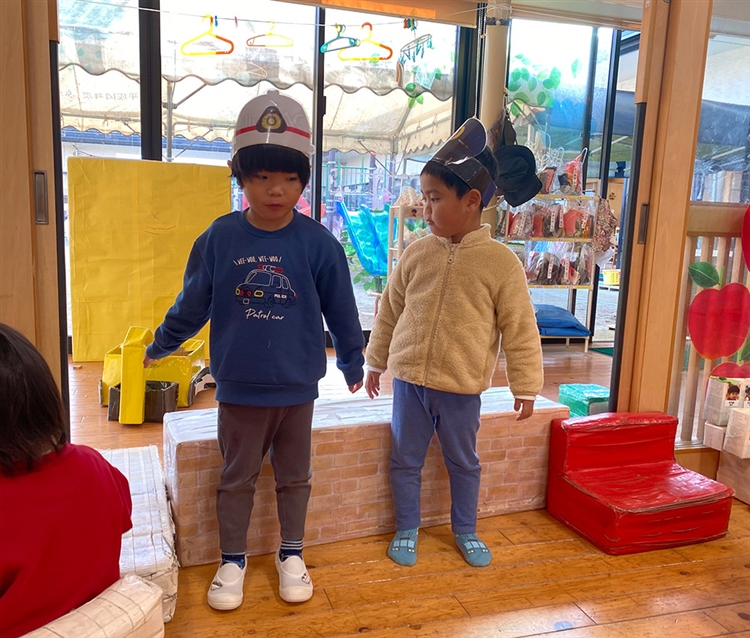 2歳児のA君とB君が、段ボールの机や椅子をクラスのドア付近に持ってきて道を作っていました。「全部赤信号なんだよ」「今は通れません」と、2人は門番のようにして立っていました。