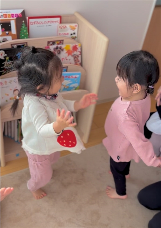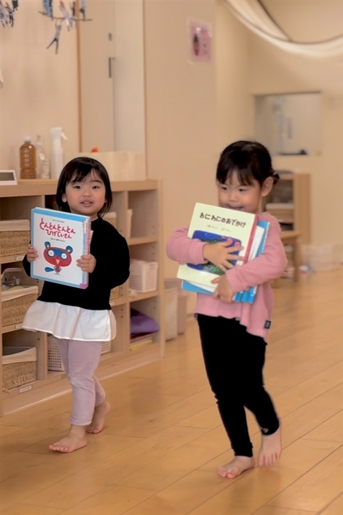 子どもたちも一緒に、「どこに置こうかな?」「これ持つね!」と声をかけながら、絵本や棚を動かして、引っ越しのお手伝い。