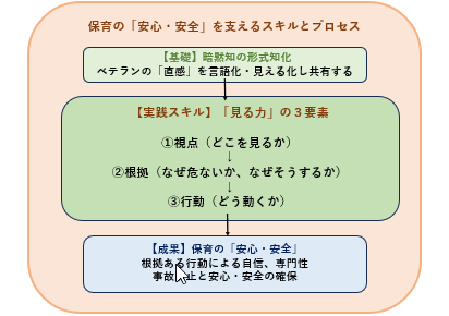 現場でよく聞かれるのが、「先輩の背中を見て覚える」という言葉です。しかし、安全に関わる場面で、経験則だけに頼るのはリスクがあります。ベテラン保育者が無意識に行っている「これは危ない気がする」という感覚(暗黙知)を、誰にでもわかる言葉やチェックポイント(形式知)として共有・見える化することが重要です。