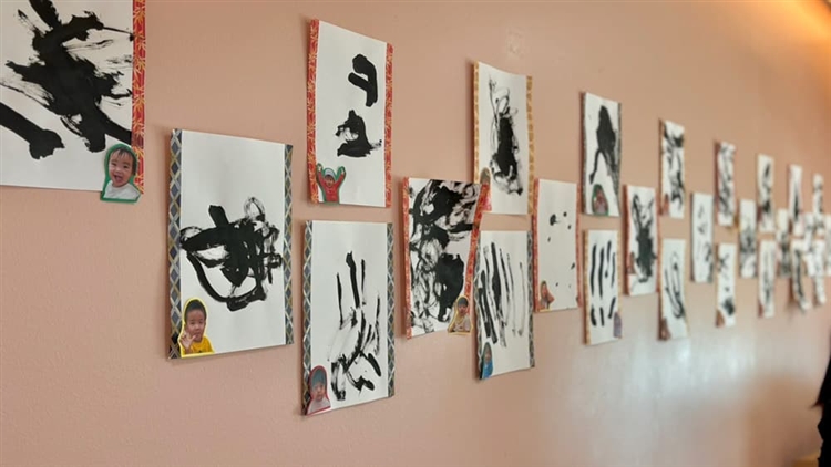 白い紙の前に座り、初めは少し緊張した様子の1歳児と2歳児の子どもたち。ベビーヨガで教えてもらった深呼吸で、少し心を落ち着けて、、、