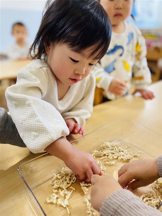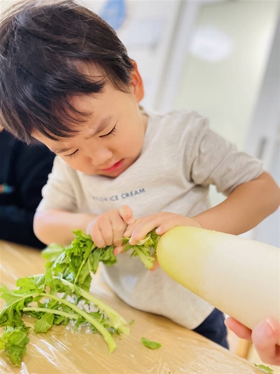 1 歳児と 2 歳児で「切り干し大根」づくり。