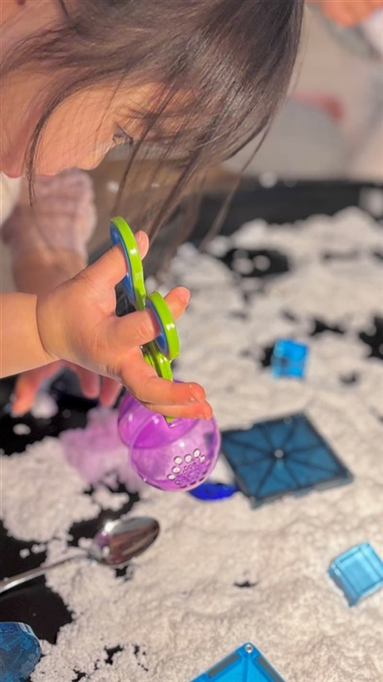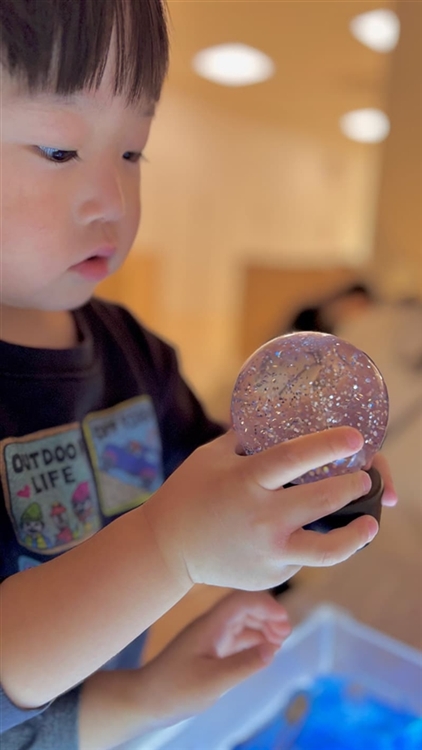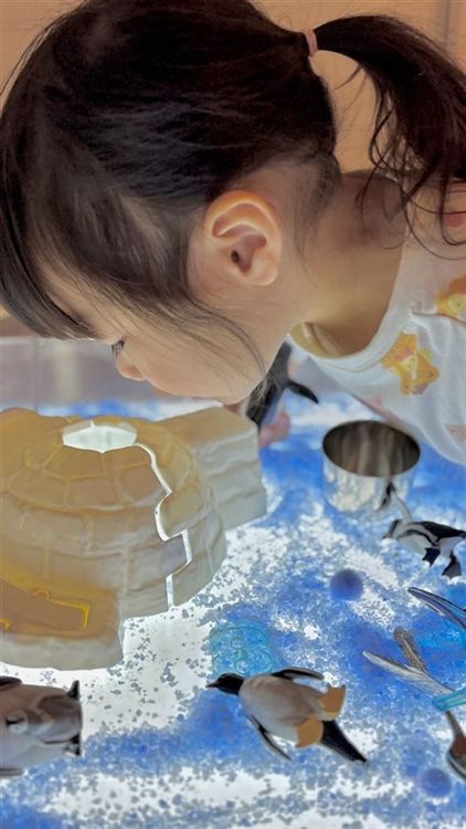 センサリープレイの時間が大好きな2歳児の子どもたちにとって、南極と北極は未知の世界。フワッフワの雪をあつめて、キラキラと光る氷にふれて、五感をフルに使いながら、世界観にスーッと入り込んでいく子どもたち。