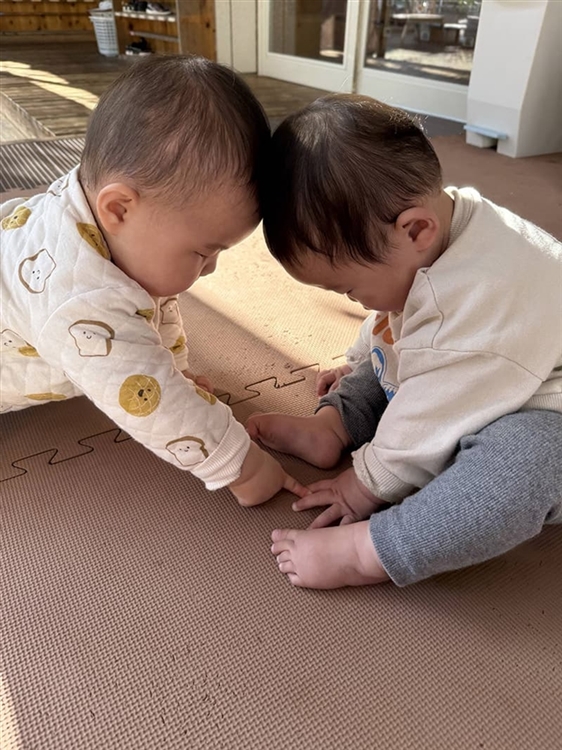 0歳児のRちゃんとKくんは、テラスにある小さな穴を見つけました。