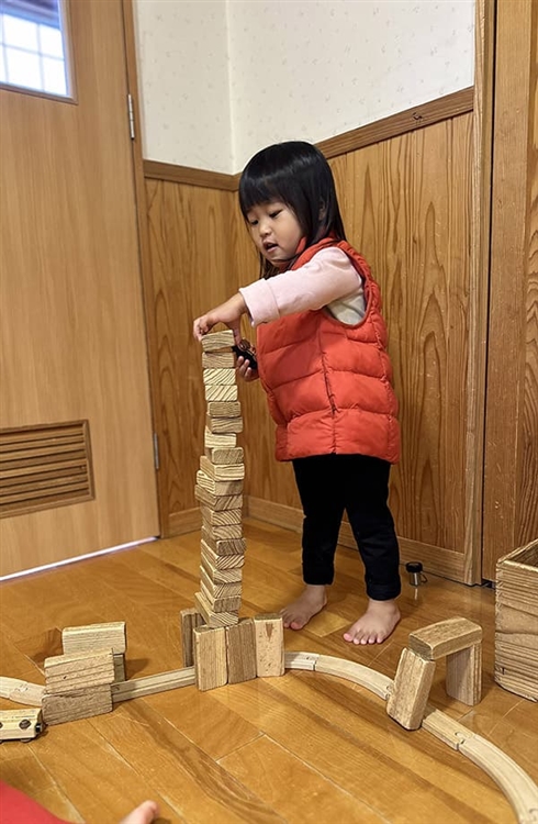 積み木の向きを縦にしたり横にしたりしながら、どの置き方が安定するのかを確かめるように工夫する姿が見られました。積み木が倒れてしまうと一瞬驚いた表情を見せますが、すぐに気持ちを切り替え、自分で積み直そうとします。
