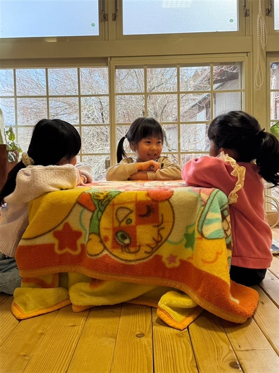 翌週、室内に即席のこたつが用意されると、Sちゃんは目を輝かせ、友だちを誘って中に入り、会話を楽しむ様子が見られました。身近な生活への関心を広げながら、言葉や友だちとのかかわりを深めていく姿が育まれているように感じました。