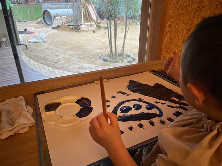 窓の外の空を見ながら絵を描く男の子。