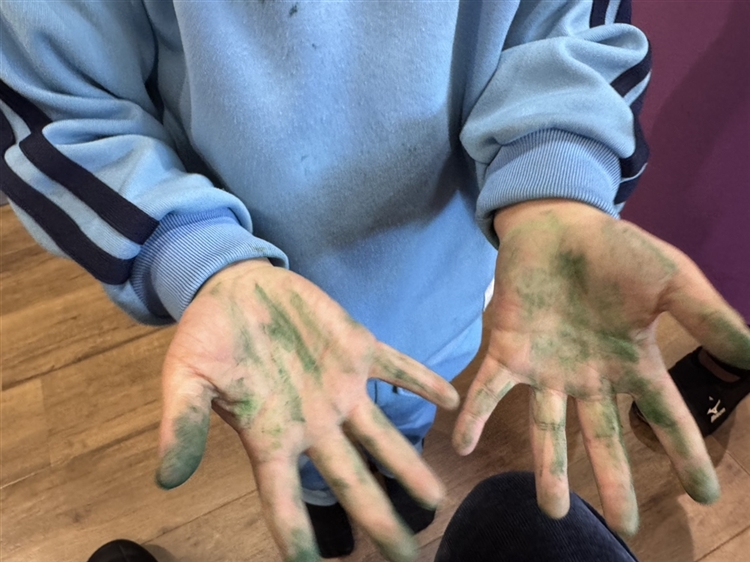 「この緑は力をいっぱい入れて塗った」