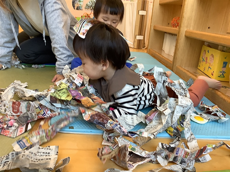 保育者と一緒に新聞をビリビリ破って遊んでいましたが、破れた新聞がたまると、その上に寝そべって泳ぎ始めました。新聞をプールに見立てたのでしょうか。破った新聞紙の感触や音を全身で楽しむ様子が見られました。
