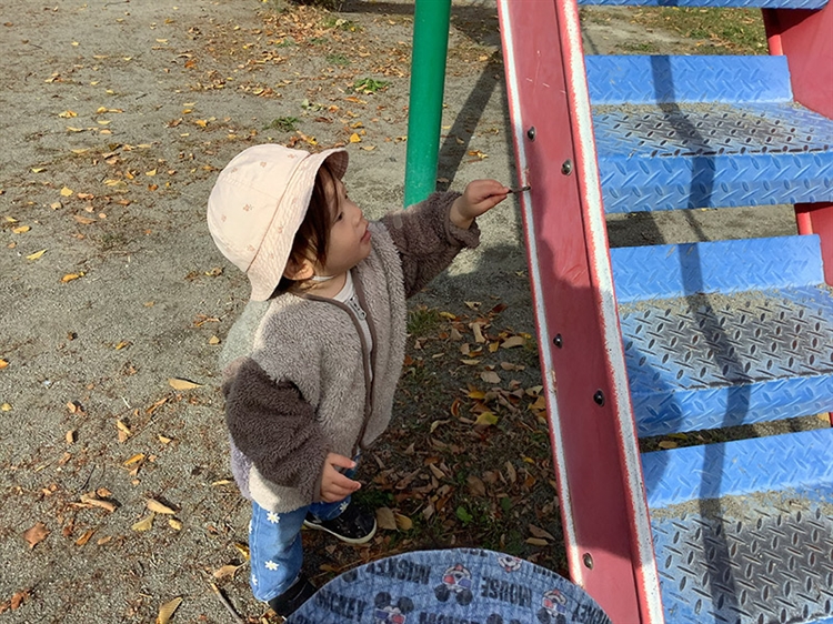 木の枝で滑り台を叩くと、カンカンと音がなりました。実は前回公園に行ったときにも、同じあそびを楽しんでいました。