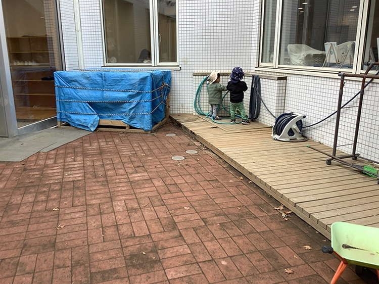 夏の水あそびのとき、ここから水が出ていたことを覚えていたようで、なんとか水を出そうと2人で相談中……。
