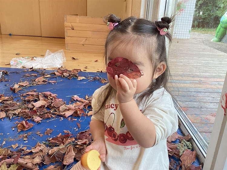 お部屋いっぱいの落ち葉で遊んでいたときに、穴の開いている葉っぱを見つけました。しばらく観察をしていると、何かに気づいたようで、先生に穴をあけてほしいとお願いしました。