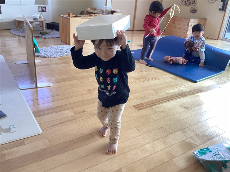 この日はおままごとをしていたお友だちが、空き箱を見つけて玩具を入れたり中に入ったりして楽しんでいました。そのうちに、突然空き箱を頭にかぶり腰をかがめて「1.2.1.2…」。