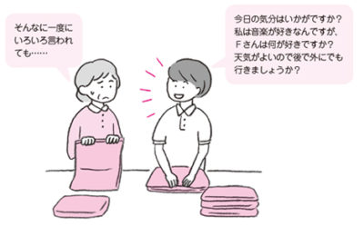 一度に色々と話されたらどんな気持ちになりますか。あまりいい気持ちにはなりませんよね。それは利用者も同じです。投げかけるだけの言葉は、不快感を与えることになります。