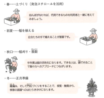 その季節だけかかわるという単発な支援をするのではなく、春から冬にわたり1年を通して活動していくものを考えたりすることが、「記憶・認識」や「見当識」へのアプローチにつながっていきます。