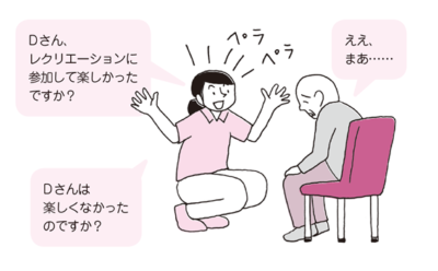 いつも物静かな利用者さん(Dさん)と会話をしようと、介護職が、あれこれと質問をしています。