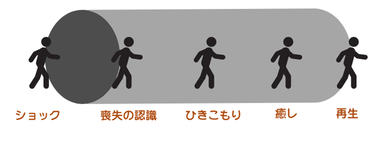 大切な人や何かを失ったとき、人はショックを受ける。その後、「これは現実の喪失だ」と認識するにつれ、感情は激しく混乱し、葛藤に直面する。その時期が過ぎると、エネルギーを消耗し、絶望を感じながら深い闇へとひきこもっていく。そこから長い時間が過ぎ、やがて少しずつ時間をかけて癒しを経験し、やがて再生へと向かう。